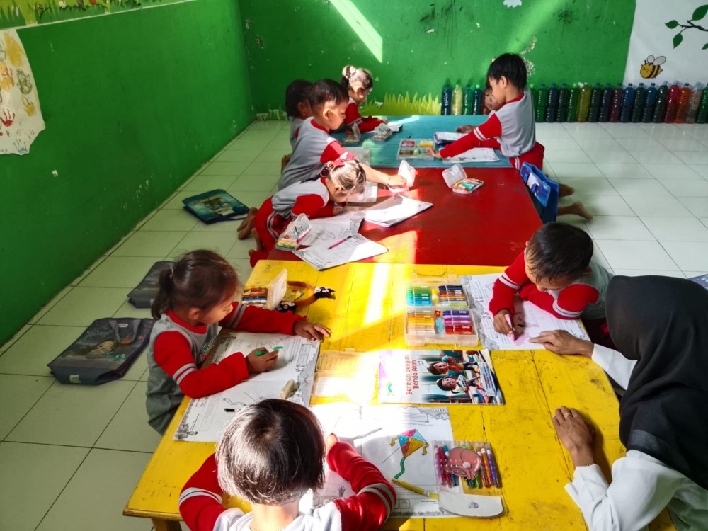Suasana kelas tampak hidup dengan berbagai warna yang dituangkan oleh anak-anak di atas kertas. Tawa dan keceriaan menghiasi kegiatan tersebut, menunjukkan betapa anak-anak menikmati proses belajar sambil bermain.